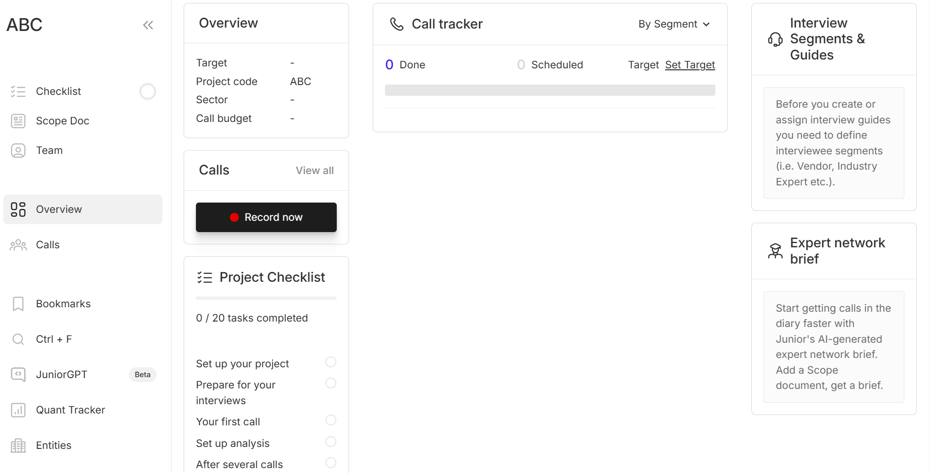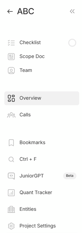 * Various **workflow modules** in the app: Call Tracker, Bookmarks, Ctrl + F, JuniorGPT, Quant Tracker, Entities, Project Settings