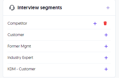 For each Segment in this card, you can Add an Interview Guide with the '+' icon on the same row. You can also delete the segment with the trash bin icon.
