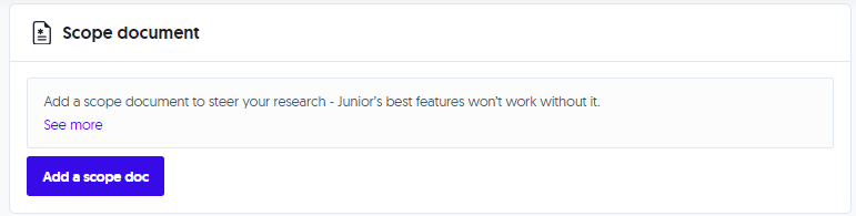 This section shows a summary of the Scope Document you've dropped in during the onboarding flow. If you didn't drop it in then, you can add it here after. Scope documents are important because they influence the text output of the models in Junior - read [here](https://docs.myjunior.ai/onboarding-flow#expert-network-brief) for more information.&#x20;