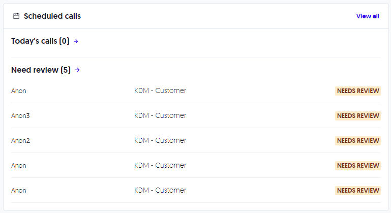 * **Need Review**: calls you have conducted that still need a Transcript Review. We'll cover this in depth later, but it's a quality control layer that you need to pay attention to!