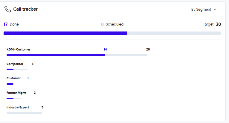 The Call Tracker visualisation shows you a snapshot of the progress on the primary research you've conducted to date. Here you can see how many interviews you have Done, how many are Scheduled and how those relate to the initial Targets set. The progress bars are shown both in aggregate and by segment.&#x20;