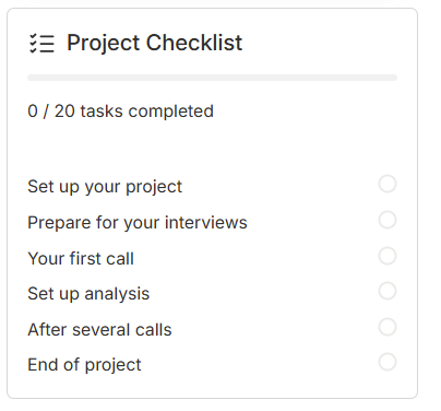 <figure><img src="https://235699547-files.gitbook.io/~/files/v0/b/gitbook-x-prod.appspot.com/o/spaces%2FpmD35RxC2Ai8VHxCaRdO%2Fuploads%2Ft4goE3zcTq3iUOuz6iDc%2Fimage.png?alt=media&#x26;token=c7d58c67-59ff-4af8-9eb5-df50f4281409" alt=""><figcaption><p>Project Checklist - LHS Overview screen</p></figcaption></figure>
